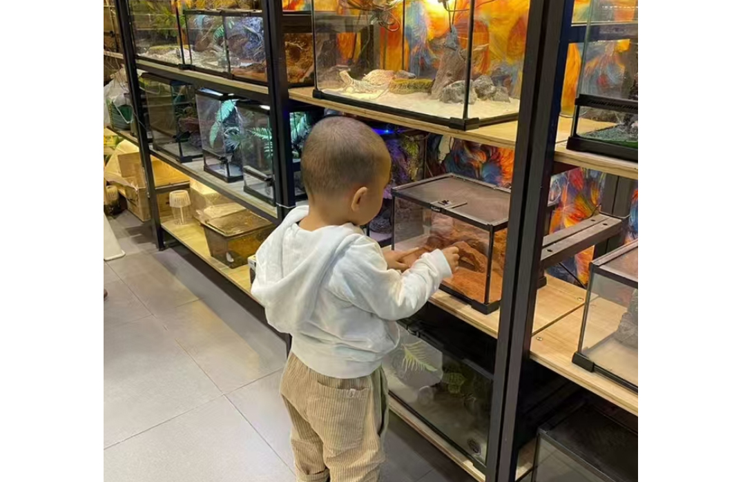 受顾先生的影响,身边的朋友也对爬宠有了兴趣,他们也会来顾先生这里选购幼苗。受影响最大的则是顾先生3岁大的儿子,会跟在爸爸身后喂食浇水,指着每一个爬宠叫出他们的名字。