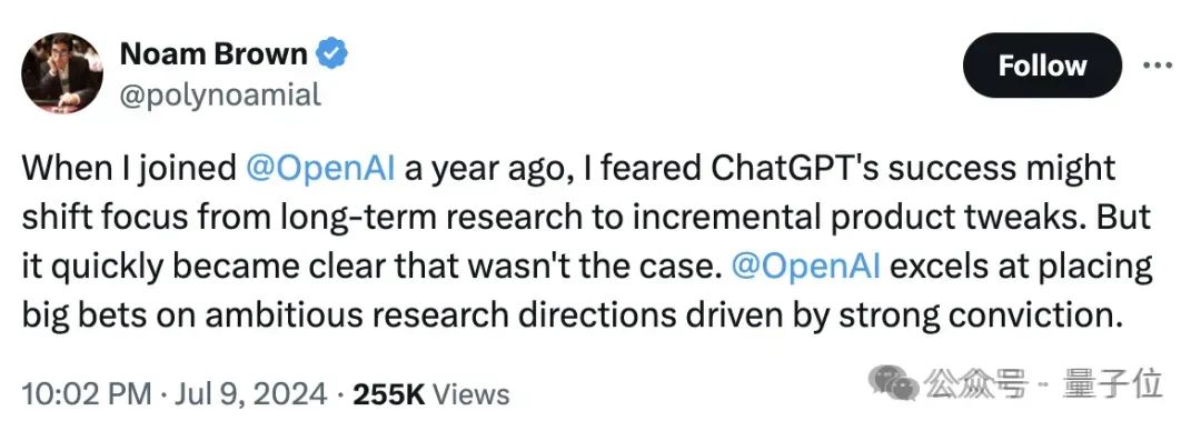 在草莓项目正式被曝光的前几天,OpenAI科学家Noam Brown发了一条推特,感慨OpenAI总是会坚定地在重大研究方向上持续押注。