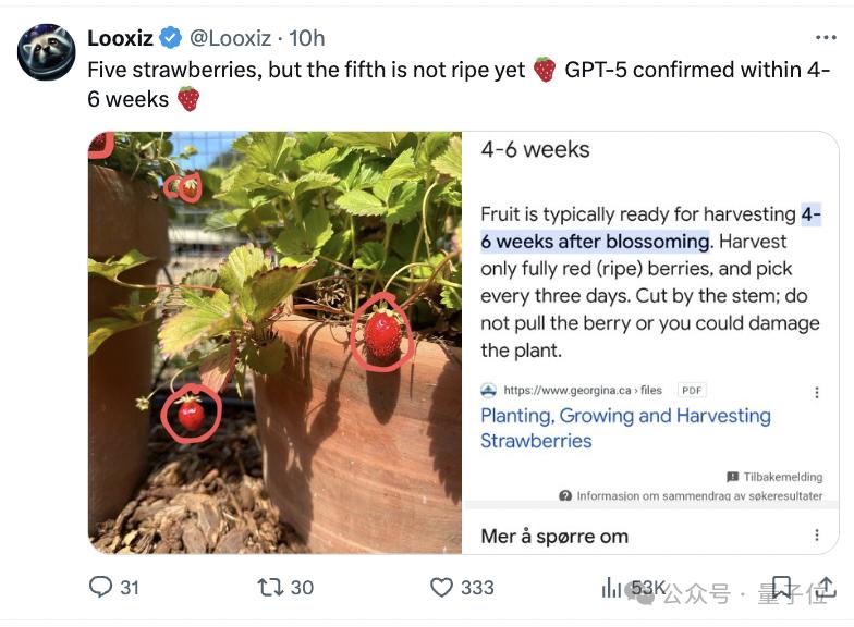 如图所示这张图有五个草莓,但第五个还没有熟。而草莓成熟的时间在4-6周内,说明GPT-5也将在那时候发布。
