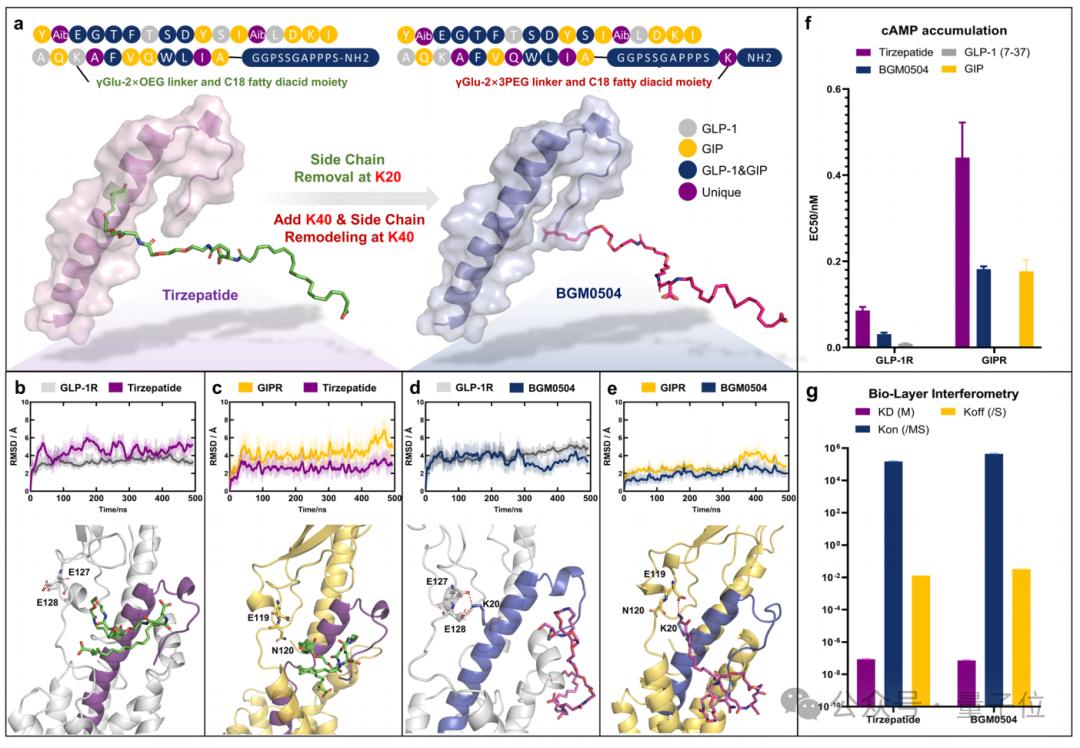 本项研究使用分子动力学模拟,发现非乙酰化Tirzepatide与GLP-1R/GIPR在K20位点形成的关键盐桥能够起到稳定靶点激活态构象的作用,这一特征在冷冻电镜结构中未被观察到。