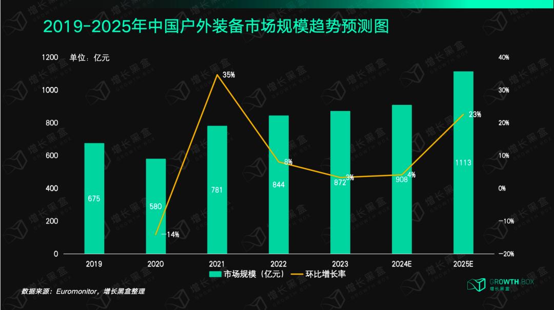 运动户外人群规模的增长和更进阶的垂直类目进一步打开了户外运动消费者的装备需求,自2020年起,我国的户外装备市场规模一直呈现出显著增长的态势,预计到2025年将突破千亿市场规模。