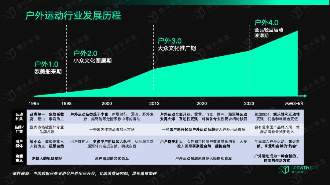 根据艾瑞测算,当前全国户外人群规模约有5.4亿,而表达强烈参与意向的潜在人群约有2.3亿,增量空间巨大。