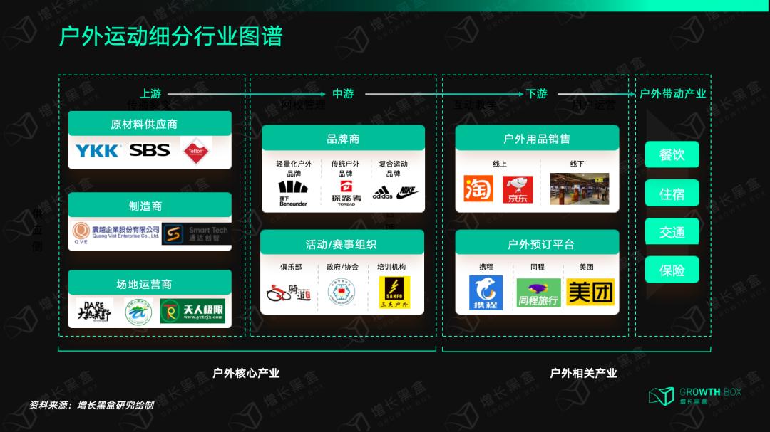 目前,户外运动行业产业链上游主要包括户外用品的原材料供应商、成品制造商及户外活动场地的运营商。