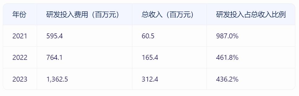 2021年研发投入达5.95亿元,是总收入(0.605亿元)的9.87倍;2023年研发投入约13.62亿元,是总收入(3.12亿元)的4.36倍。