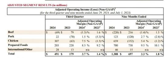 近日,泰森食品公布了2024年第三财季的最新业绩,调整后的利润约 4.91 亿美元,主要得益于鸡肉、猪肉业务的良好表现。