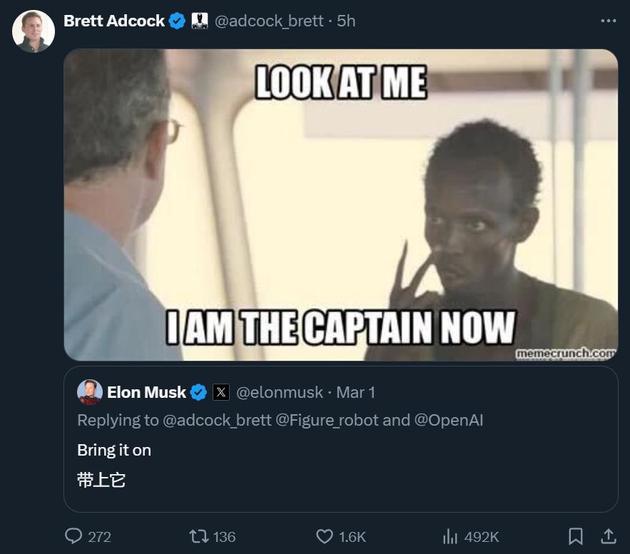 创始人 Brett Adcock 更是圈出马斯克,丢了个表情包,暗示自个儿才是行业龙头。