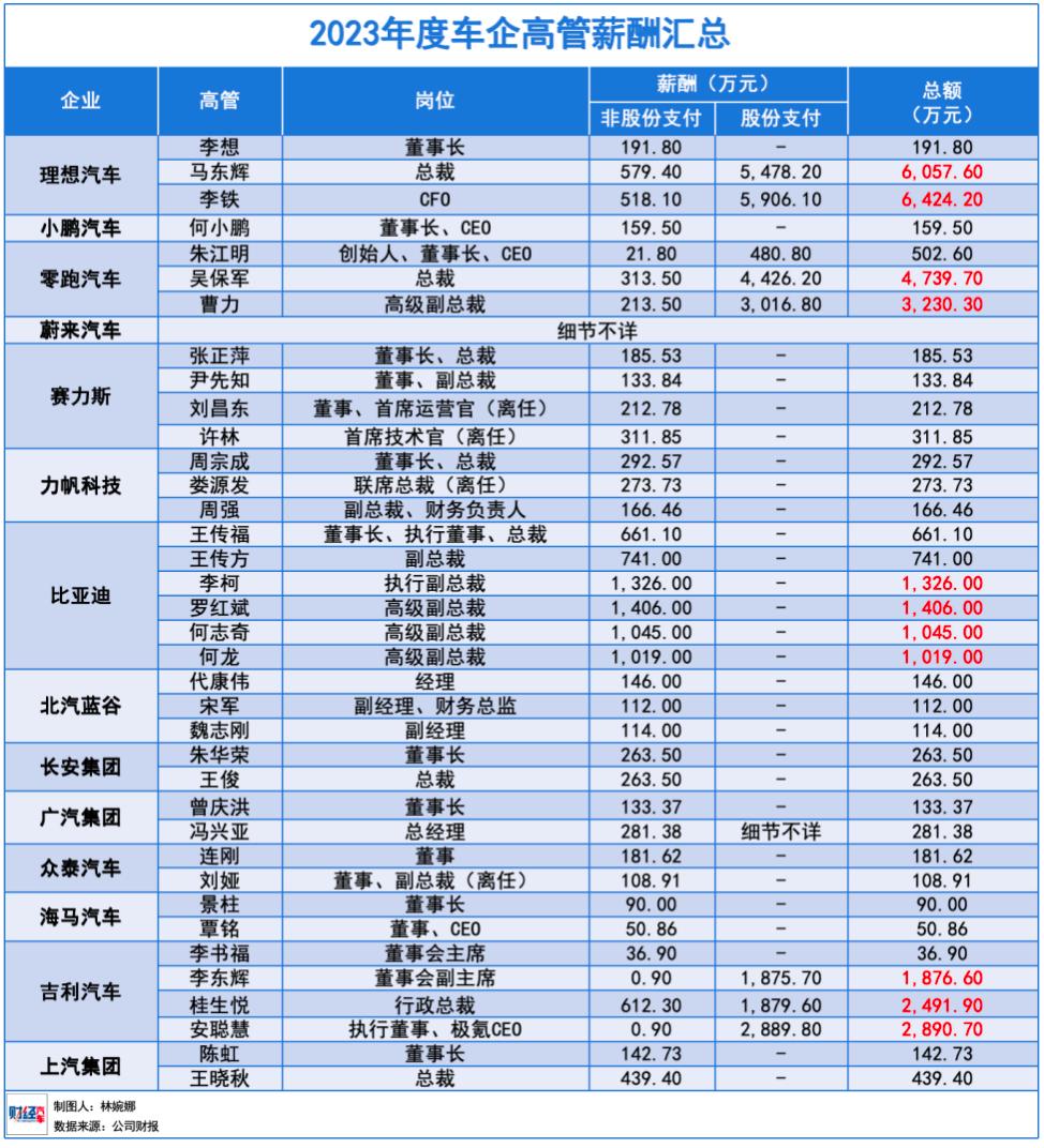 最亮眼的则是第一梯队的新势力车企,理想汽车的CFO李铁薪酬最高,达到6,424.2万元,而零跑汽车的高管吴保军(2024年1月劳动合同到期离职)和曹力也分别达到了4,739.7万元和3,230.3万元的高薪。