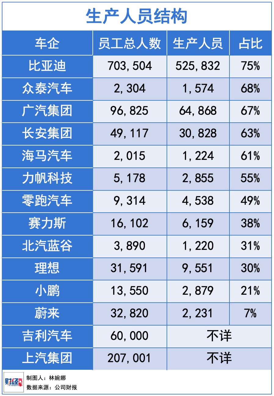 而在新势力车企中,生产人员的数量却被大大减少。尤其是蔚来,员工总数32820名,但生产人员只有2231名,仅占其总数的7%,显著低于销售人员(占比52%)和研发人员(占比34%)。