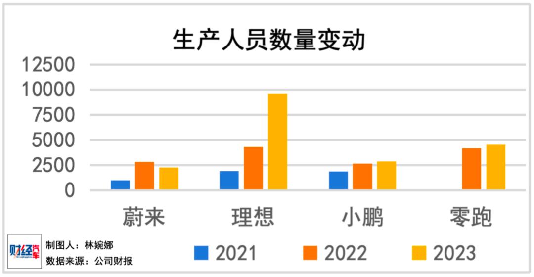 小鹏的生产人员占比为21%,低于销售人员的35%和研发人员的40%;而理想的生产人员占比虽略高达到30%,但仍低于占比为39%的销售人员。