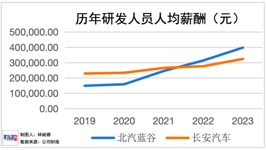北汽蓝谷研发人员薪酬从2019年人均14.9万元(估)跃升至2023年的39.75万元,增长率约为167%;长安汽车的研发人均工资则从22.88万元(估)提高到32.41万元,增长率约为42%。