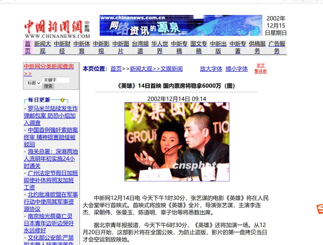 国产电影中,第一个吃首映礼螃蟹的电影是由张艺谋导演的《英雄》,2002年,也是一个春节档,作为国产电影商业化的重要作品,《英雄》在北京人民大会堂举办了全球首映礼。