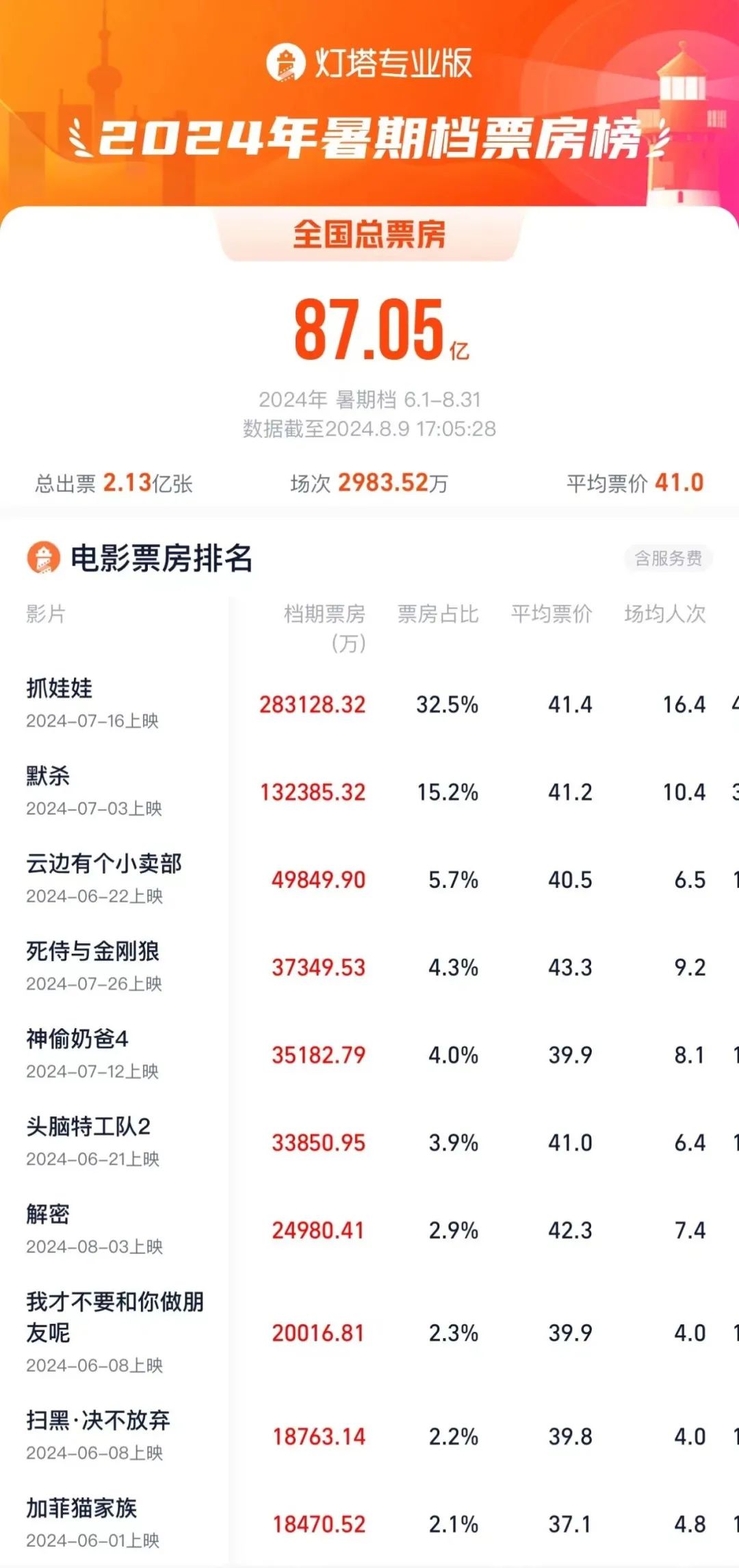 截至目前,2024年暑期档过半,但票房90亿都不到,2023年暑期档成绩是206亿。