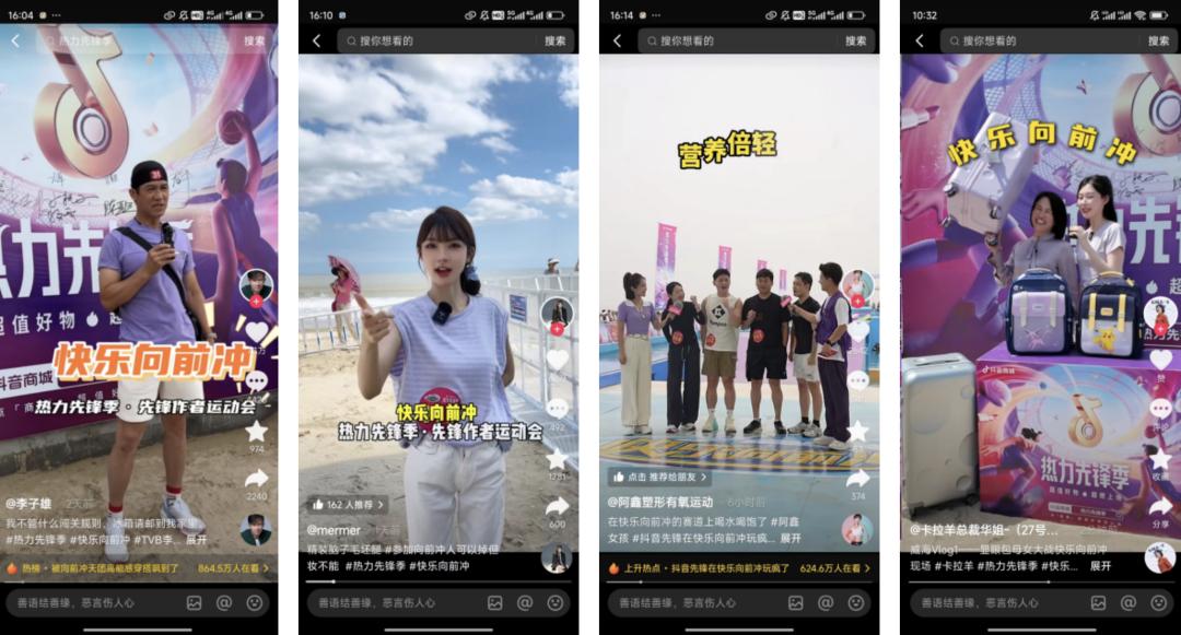 抖音电商联合某卫视定制的电商内容《快乐向前冲》,每期内容都会揭示多个赛事重点趋势类目和货品,包含运动装备、亲子潮玩、美妆彩妆等,这让不同产品类目的商家都能找到分享赛事机遇的新入口。