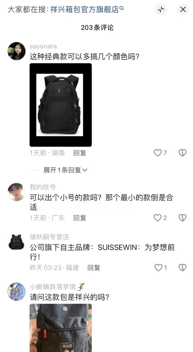 除此之外,商家和平台之间的双向奔赴也至关重要。除了热点的捕捉和放大,平台还在相关热门视频的评论区埋入了“祥兴箱包”小蓝词,用户可以点击转跳搜索祥兴箱包的产品,快速完成从种草到购买的流程。