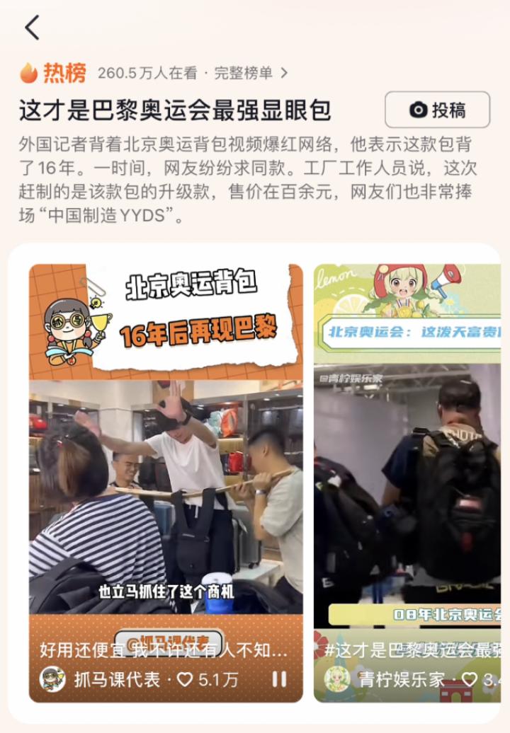 再往前追溯,针对北京奥运背包热点本身,抖音电商也下了不少力气,为商品的热卖做了有力的铺垫。除开始助热、联系祥兴箱包外,还抓住了#重生之我在奥运为网友做书包、#北京奥运同款背包都刷成NPC了、#没想到奥运让国货箱包卷起来了 等创意话题。