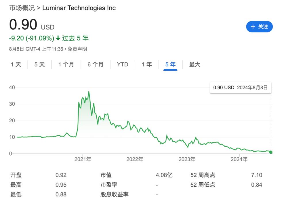 激光雷达的明星企业Luminar Technologies的股价已经跌至不到1美元。2024年第二季度Luminar的收入仅为1645万美元,环比下降 22%,比分析师预期低19%;净亏损1.306亿美元,较2023年第二季度收窄7.9%。业务扩张步伐较慢,年年亏损,使得Luminar 陷入困境。Luminar计划重组其债务,将 4.22 亿美元的债券减少至 2.74 亿美元,并将到期日从 2026 年延长至 2030 年。并且精简运营,裁员20%。
