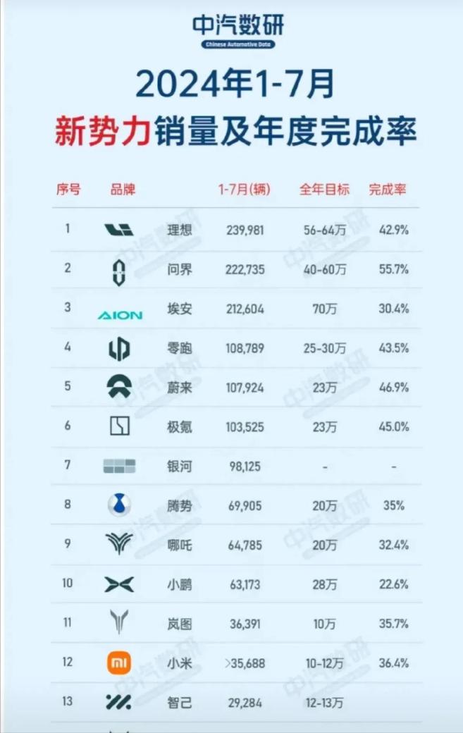 此外,2024年1-7月新能源汽车全年销量完成率及销量出炉。完成率最高的是问界目标40-60万台,目前已达到55.7%。其次是蔚来,极氪,完成率达到46.9%、45%。