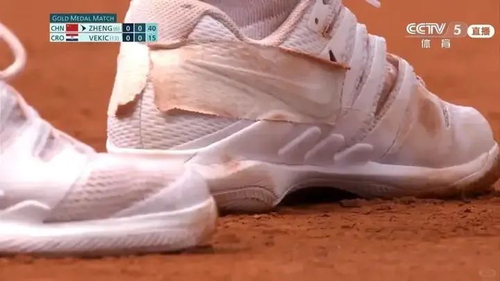 到这一步,阿迪达斯看似占了上风,但是,也不知是导播故意还是耐克的授意,现场直接对着郑钦文的球鞋来了一个超长的特写镜头。于是,全世界的观众都看了出来,胶布里透出来的是耐克的“钩子”。还有网友贴心的给耐克配上了文案:“实力盖不住”。