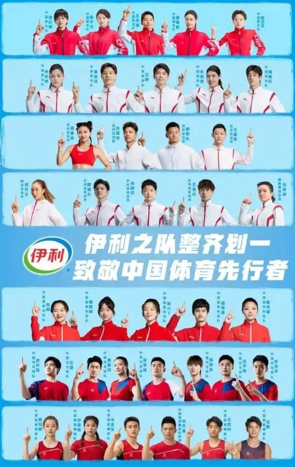 还是以伊利为例,此次奥运会其签下了郑钦文、孙颖莎、樊振东、王楚钦、刘清漪等多位参赛选手,覆盖了跳水、乒乓球、游泳、攀岩、霹雳舞等多个中国有金牌点的传统优势项目,以及年轻一代更关注的新项目,号称“伊利之队”。