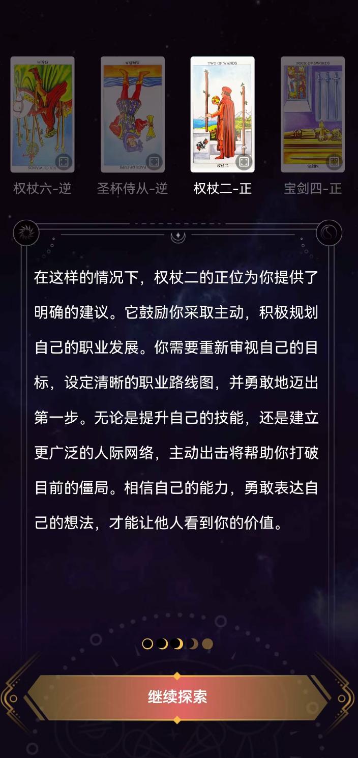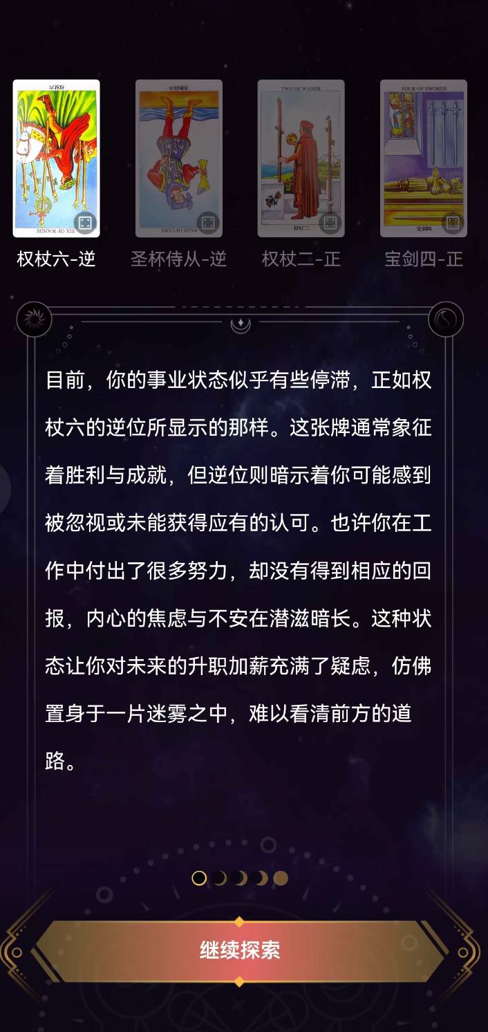 鲸哥也尝试着用月见塔罗的小程序给自己的事业算了一卦,出来的牌虽然有逆向的,但整体的话语会朝着积极的方向暗示,这让每一个参与占卜的人都能获得积极的心理暗示,又能从中反思自己的问题。