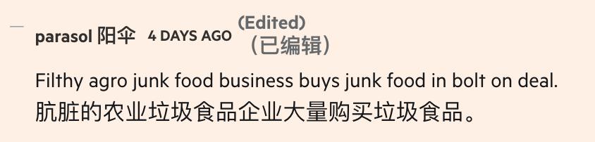 甚至有人一人喷俩巨头,说他们是 “ 肮脏的农业垃圾食品公司 ” 和 “ 垃圾食品 ” 。。。
