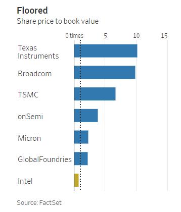 尤为引人注目的是,英特尔当前股价已跌破其账面价值,这是自1981年(FactSet有记录以来)的首次,表明市场对这家全球顶级芯片制造商的估值已低于其资产负债表上的资产净值。尽管如此,这些资产,尤其是其生产设施,仍是英特尔长期竞争力的基石。
