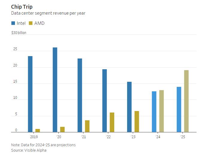 然而,英特尔正面临严峻挑战,其核心问题在于自产芯片市场需求锐减。特别是其传统强项——数据中心业务,遭受重创,服务器CPU市场份额被AMD蚕食,同时数据中心预算大量流向英伟达GPU加速器,后者正成为生成式人工智能服务的关键驱动力。根据Visible Alpha估计,英特尔的数据中心收入预计今年将滑落至126亿美元,不及四年前峰值的一半。