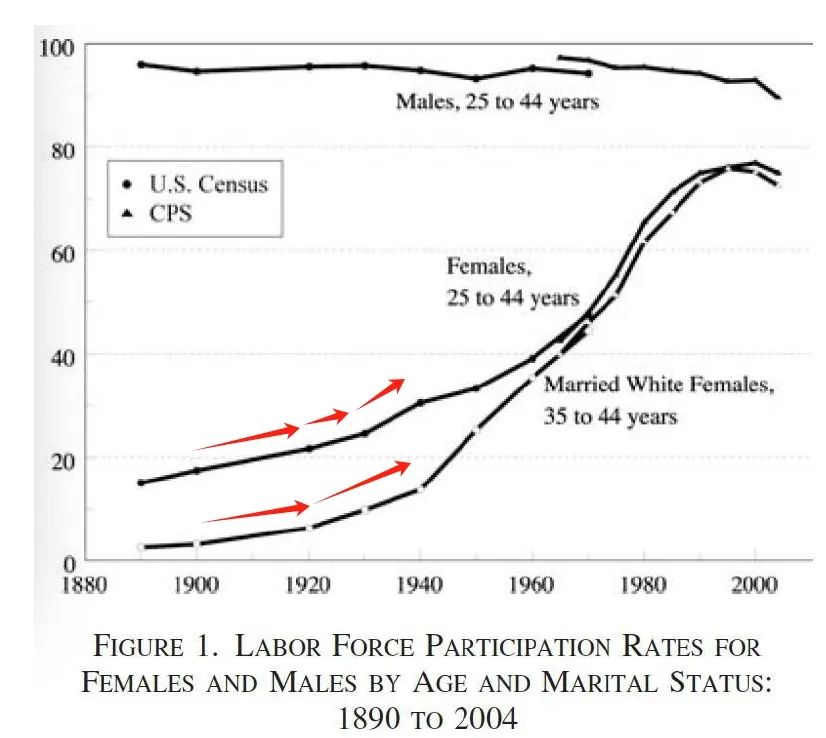 图:国1890年-2003年男女就业率Goldin, Claudia. "The quiet revolutionthat transformed women's employment, education, and family."Americaneconomic review 96.2 (2006): 1-21
