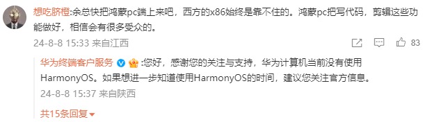 最近,在余承东恭喜MateBook GT 14上市的微博下又有人提到了鸿蒙PC,不过这次提问没有像往常一样被忽视,而是得到了华为终端客服的回应:“您好,感谢您的关注与支持,华为计算机目前没有使用HarmonyOS。如果想进一步了解HarmonyOS的发布时间,建议您关注官方信息。”