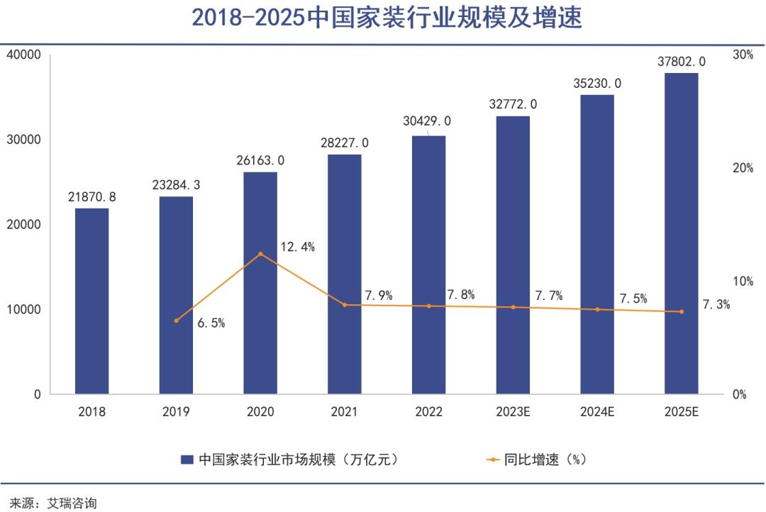 根据艾瑞咨询发布的《2023年中国家装行业研究报告》,中国家装行业规模在2025年将达到3.7万亿的市场规模,并且未来几年整个行业都将保持7%以上的增速。