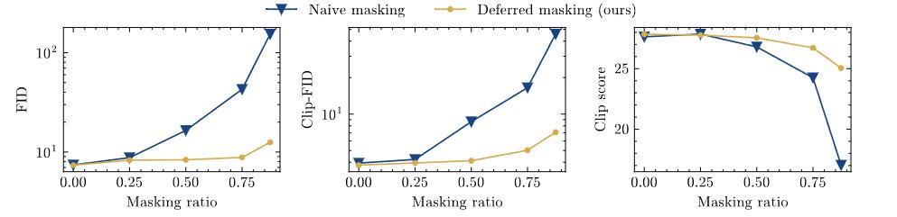 并且,与基线的性能差距随着掩蔽率的增加而扩大。在掩蔽率为75%的情况下,朴素掩蔽会将FID分数降低至 16.5,而本文的方法则达到5.03,更接近于无掩蔽时的FID分数(3.79)。