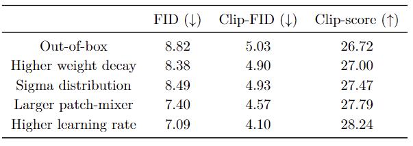 最后,作者发现使用少量的训练步骤,而将学习率增加到最大可能值(直到训练不稳定)也显著提高了图像生成性能。