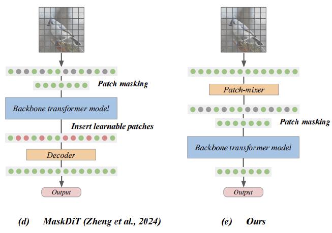 本文提出了一种延迟掩蔽策略(deferred masking strategy),在mask之前使用混合器(patch-mixer)进行预处理,把被丢弃patch的信息嵌入到幸存的patch中,从而显著减少高mask带来的性能下降。