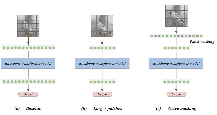 减少图像切块数可以有两种方式,一是增大每块的尺寸,二是干掉一部分patch(mask)。