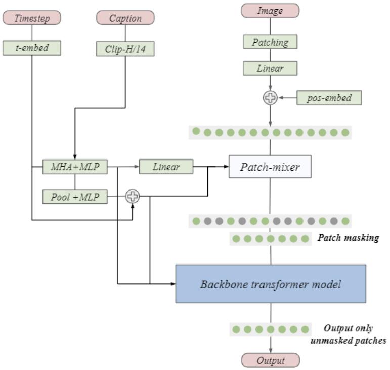 而之前最先进的方法(MaskDiT),在输出之前增加了一个恢复重建的结构,通过额外的损失函数来训练,希望通过学习弥补丢掉的信息。