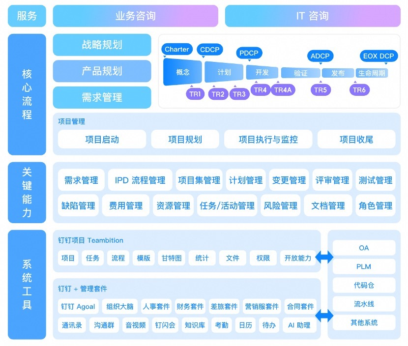 白皮书显示,目前包括士兰微、光迅科技、精测电子等在内,超过50家来自半导体、智能装备、新能源、消费电子的中大型企业,已在钉钉项目(Teambition)落地了IPD开发流程。同时,钉钉Teambition总经理王海旭宣布升级IPD解决方案,并推出IPD全景图,提供完整覆盖战略管理、产品规划、需求管理、项目管理、评审管理、知识管理、沟通管理、资源管理、PLM集成等IPD开发流程的全生命周期管理方案。