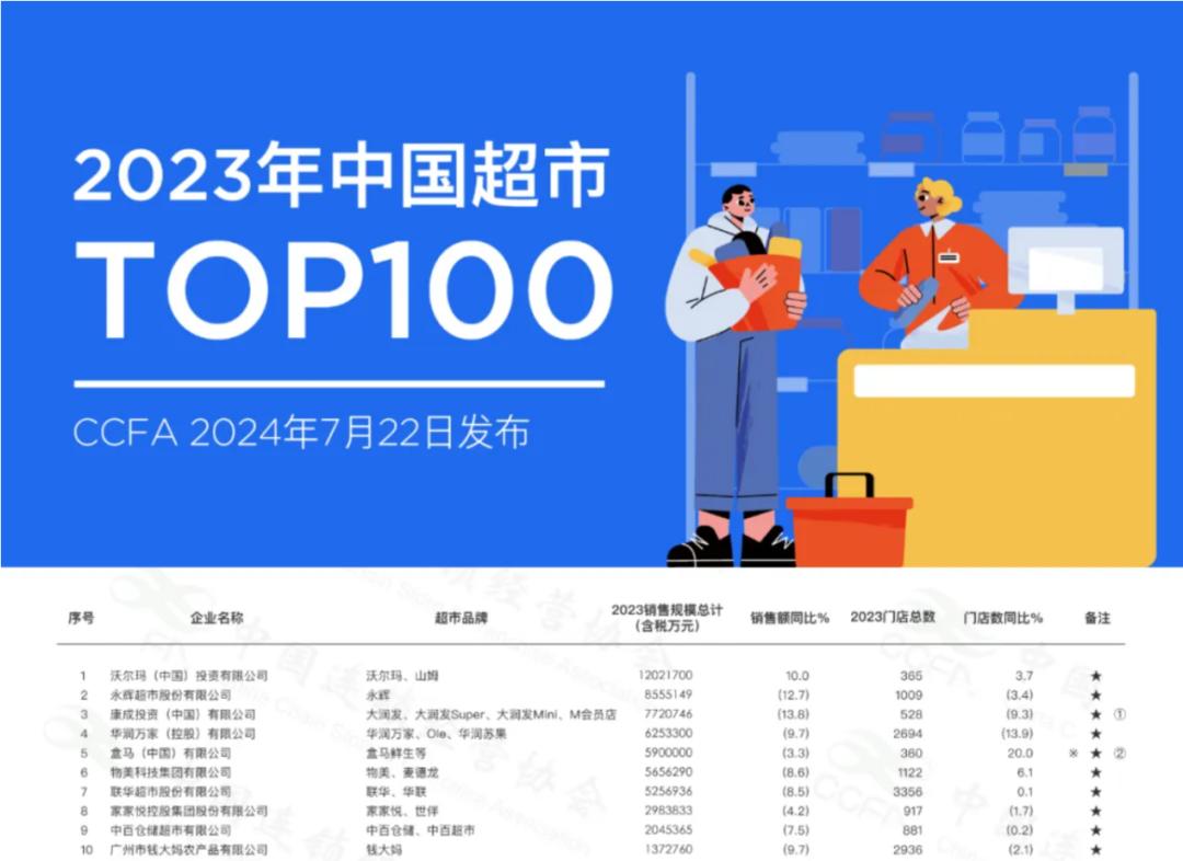 中国连锁经营协会发布《2023中国连锁TOP100》显示,2023年,超市TOP100企业销售规模为8680亿元,门店总数2.38万个,同比分别下降7.3%和16.2%。