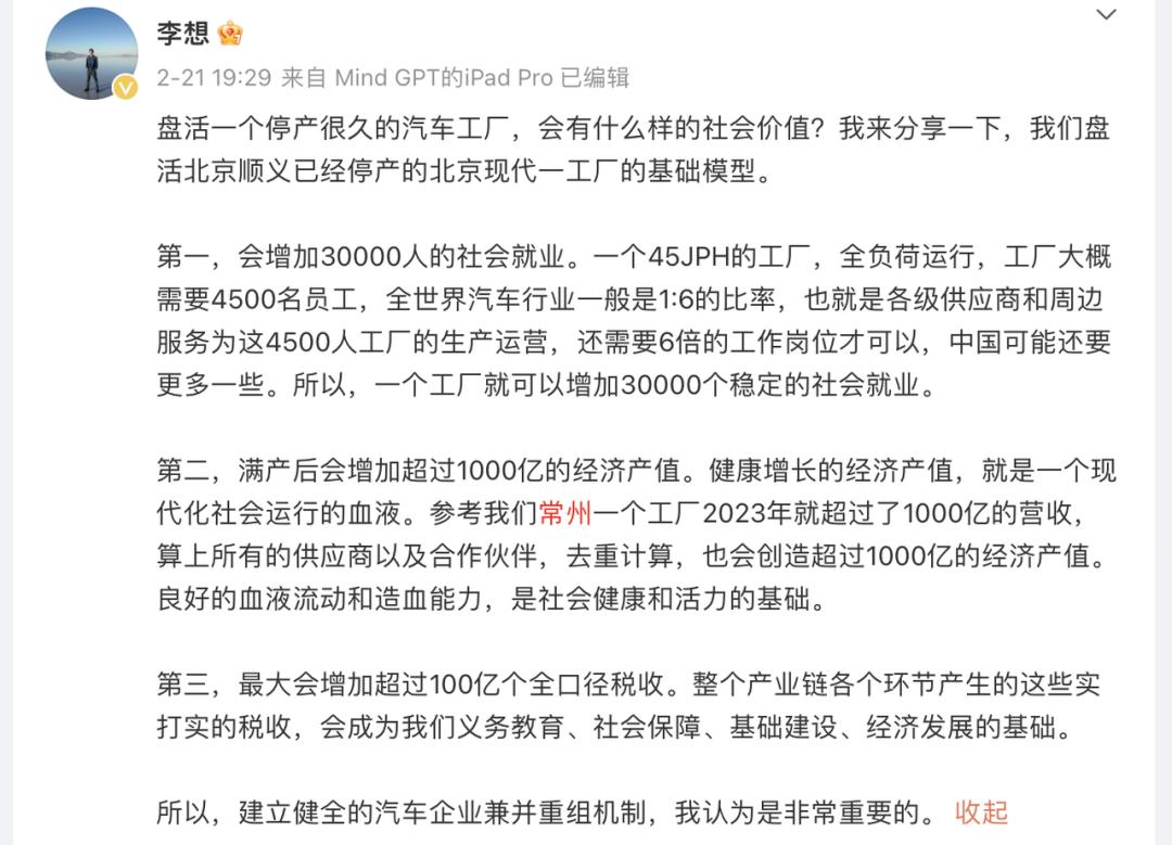 李想今年2月在他的微博中提到,“我们常州一个工厂2023年就超过了1000亿元的营收,算上所有的供应商以及合作伙伴,去重计算,也会创造1000亿元的经济价值。”