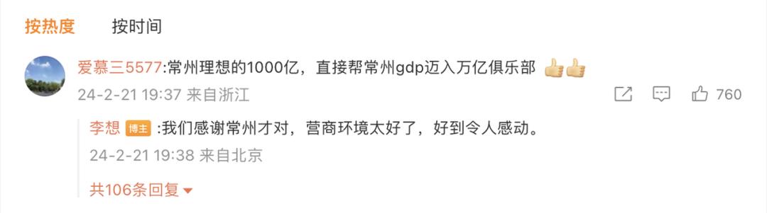年初,有网友在李想的微博下留言说,“常州迈入万亿GDP俱乐部离不开理想汽车”。李想当时的回复是,“我们感谢常州才对,营商环境太好了,好到令人感动。”