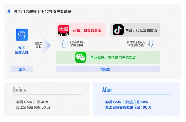 在瓴羊的助力下,朗姿已经形成以天猫、京东、抖音、视频号为组合的公域主阵地,并在私域阵地持续进行内容、服务、营销、销售,实现会员GMV贡献度达40-60%。