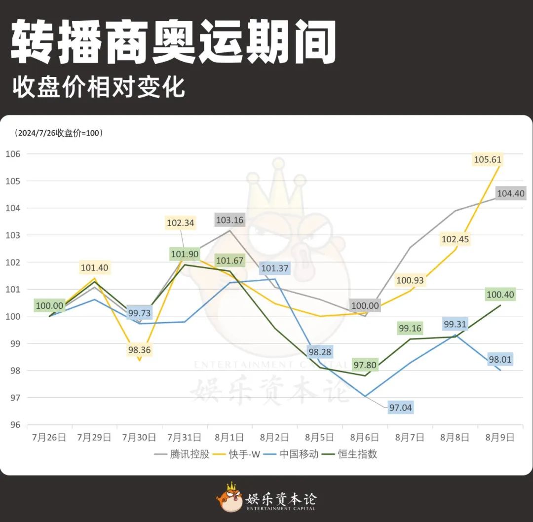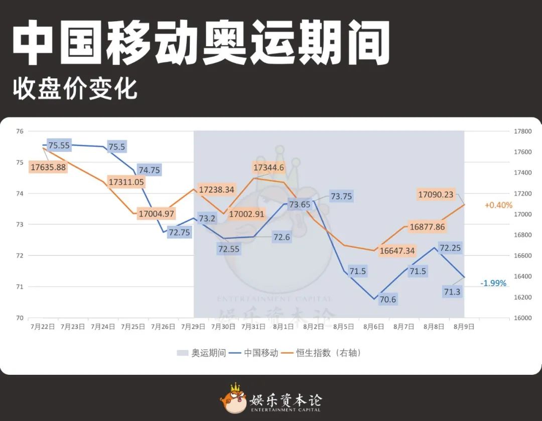 从股价走势来看,中国移动与腾讯、快手之间的表现分化同样显著。奥运期间,腾讯与快手涨幅分别为4.40%和5.61%,均明显跑赢大盘。而中国移动则在奥运期间跌去近2%。