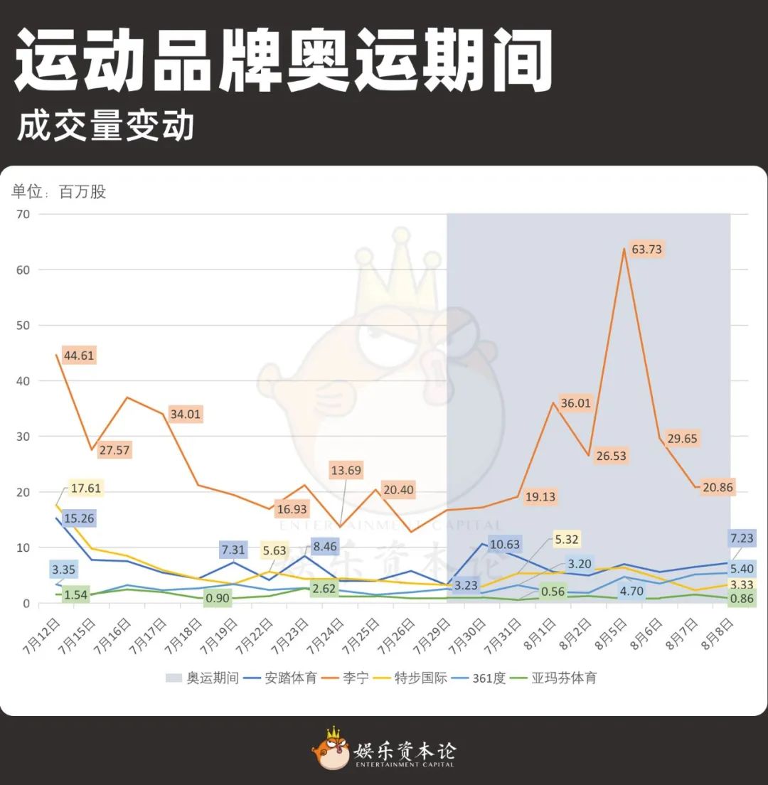 从股票成交量角度来看,李宁的“奥运交易”较其他上市公司更为突出。相较之下,安踏的交易规模也出现小幅增加;而特步、361度的交易规模则维持在常规范围内。