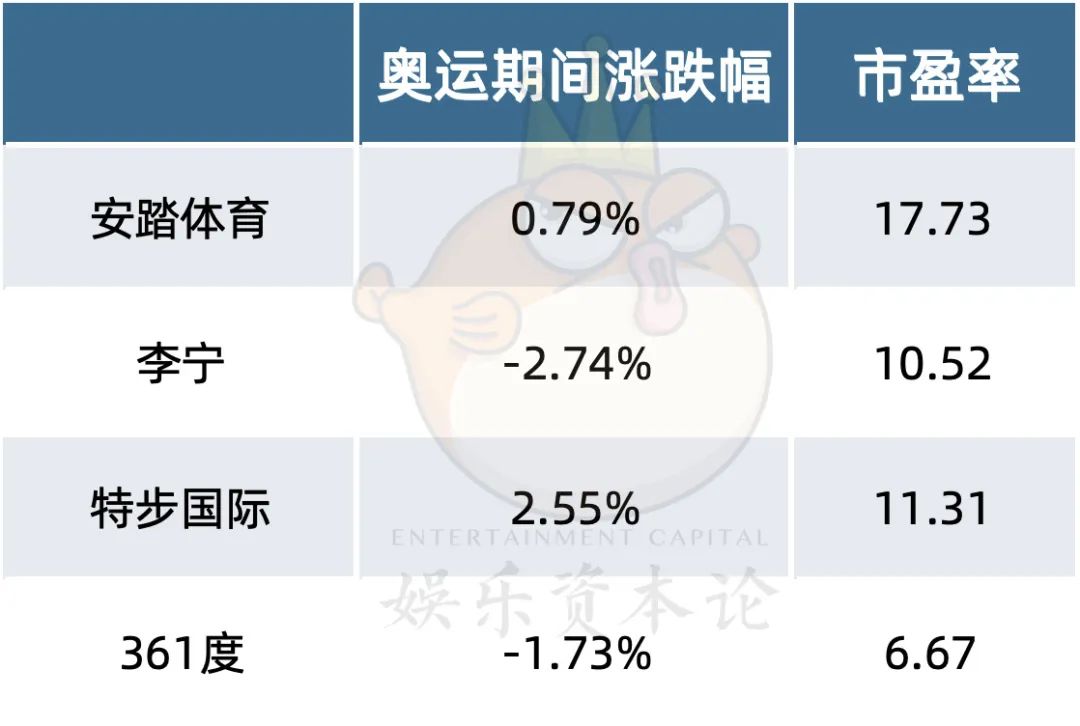 从涨跌幅来看,安踏、李宁、特步、361度在奥运期间的涨跌幅分别为+0.79%、-2.74%、+2.55%、-1.73%。安踏、特步跑赢市场;李宁、361度则相对落后。