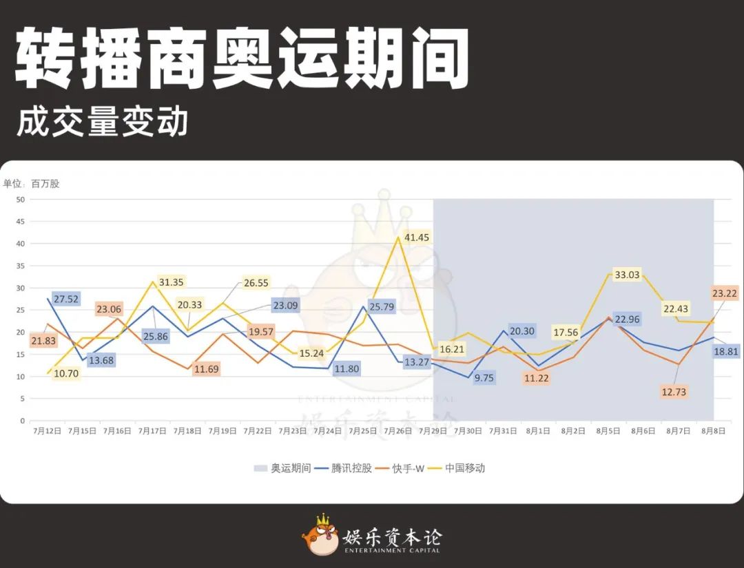 对比来看,中国移动在奥运期间的股票成交量变动最为明显。在奥运会开幕前一天,市场提前反应,成交量突然放大。而腾讯、快手的成交量则在正常范围内。