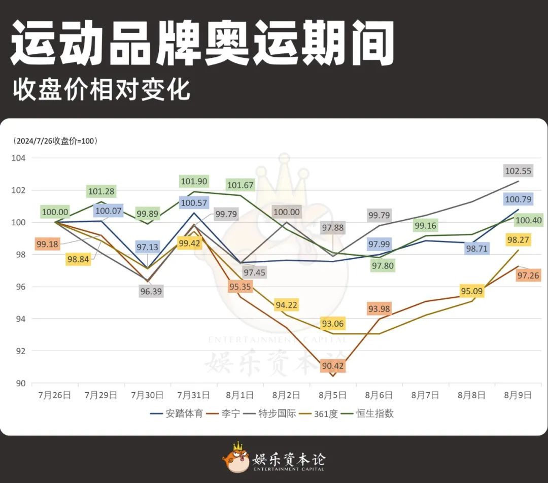 具体来看,运动品牌股价走势的分化出现在赛程中间,即7月31日到8月5日之间。安踏、特步走势在这一时期相对平稳;而李宁、361度则下滑迅速。