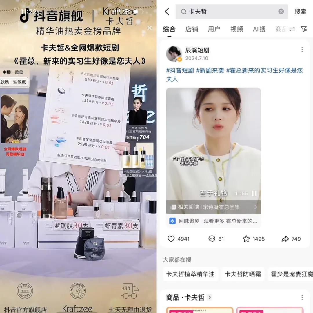 除此之外,短剧也逐渐成为达人孵化和带货直播的新形式。前段时间剧点短剧与卡夫哲定制的《霍总新来的实习生好像是您夫人》走红,在品牌官方直播间,剧中产品植入的片段循环播放,在抖音搜索“卡夫哲”,相关商品和短剧出现在同一页面,通过短剧种草进一步助推产品转化。