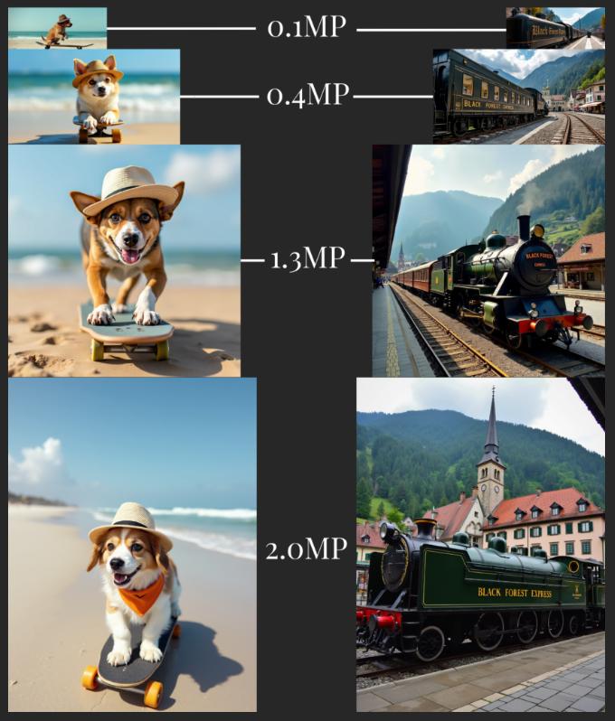 所有 Flux.1 模型版本都支持 0.1 和 2.0 百万像素的各种纵横比和分辨率。强调这个亮点,是因为市面上不少 AI 工具仅支持生成「方形」图像。