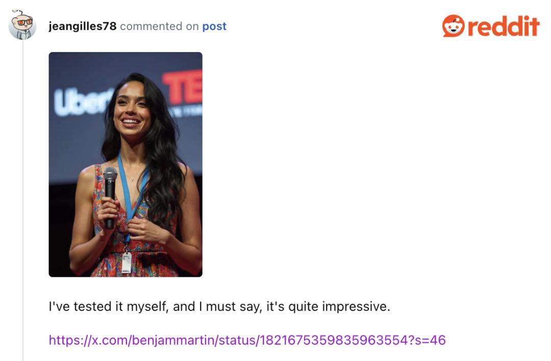 「如果我不知道第一张照片发布在哪里,我 100% 会相信这是一张真实的照片。这种疯狂的真实感。我实际上还以为我正在浏览一些关于 Ted 演讲之类的 Reddit 广告。」有 reddit 用户如此评论。还有用户认为,「Flux 确实超越了 midjourney」。