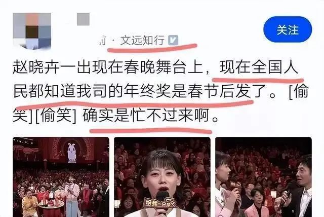 文远知行立即把春晚的热度先吃为敬。“认领”赵晓卉是其员工,表示年终奖春节后发,还隐晦表达公司一派繁忙的景象。