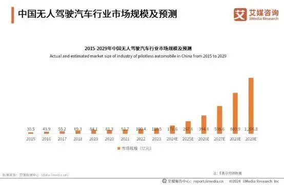 根据艾媒咨询8月1日发布的《2024-2025年中国无人驾驶汽车市场行业研究报告》,从2024年开始中国自动驾驶市场规模便迎来转折,开始每年大幅上涨,预估至2029年,市场规模达到1206.8亿元。